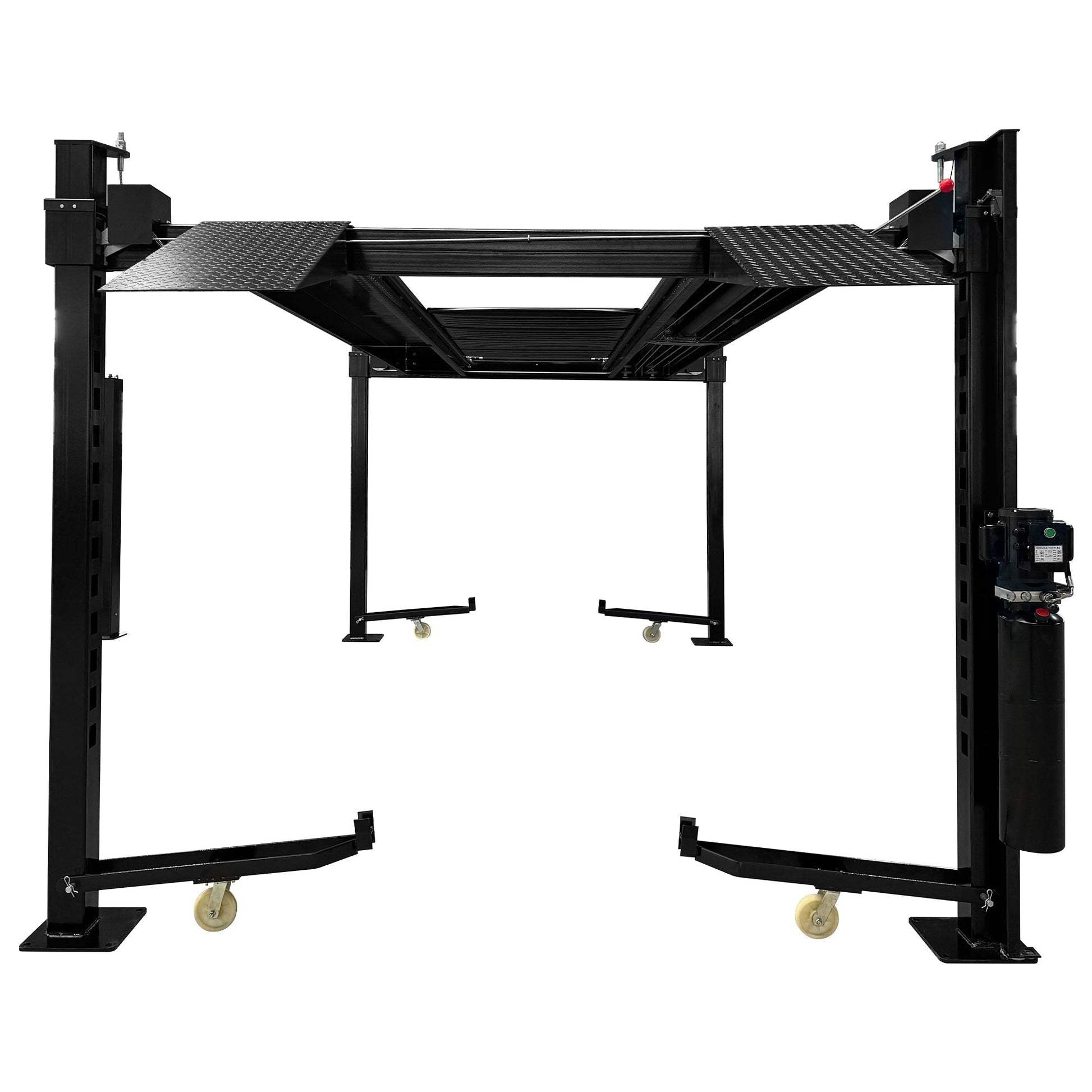 HW-4P11S 4-post car auto lift truck hoist package includes a caster kit with polyurethane wheels, a jack tray, and two removable approach ramps. The caster kit allows customers to move the lift around the garage easily and can be installed or removed in minutes. The jack tray allows customers to use a jack to lift one end of the vehicle. The drip trays(Optional) prevent fluid from the top vehicle from dripping onto the bottom vehicle. Optional sliding jacks and drip trays are available for purchase.