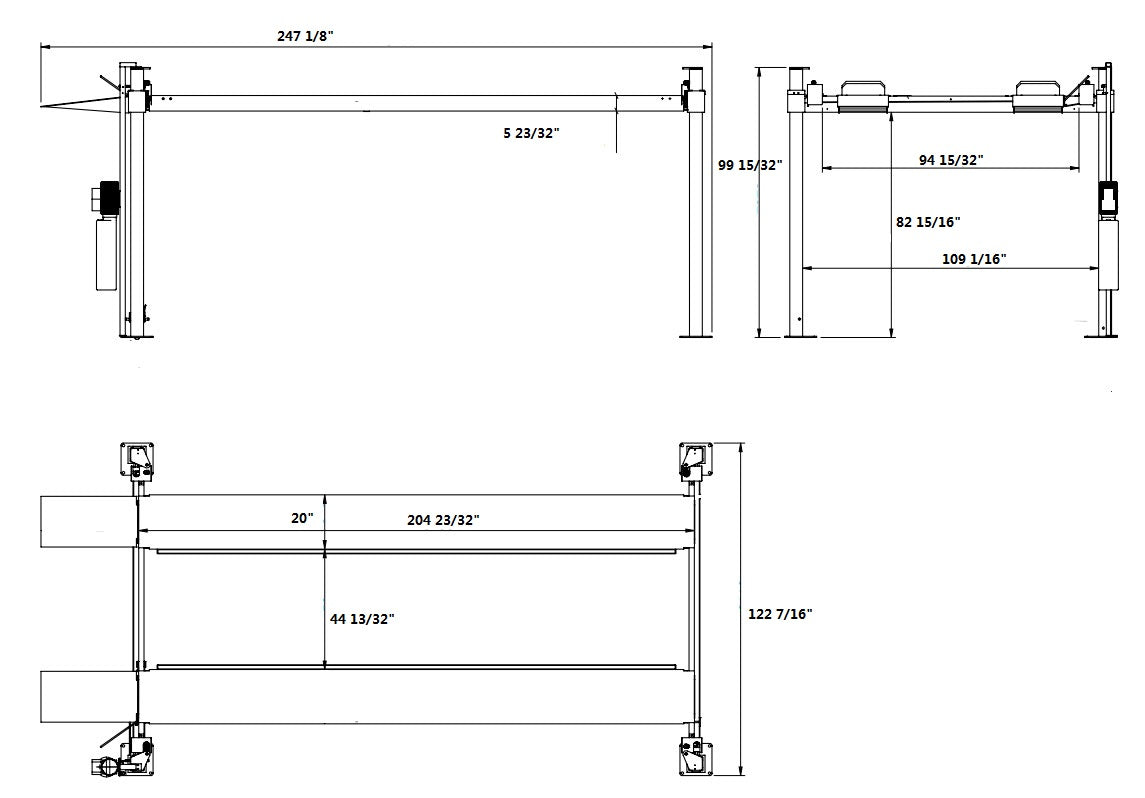 Drive Through Width 112"; Lifting Height: 88 21/32"; Overall Dimensions 247 1/8"L x 122 7/16"W x 99 15/32"H