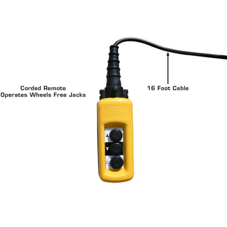 The separate control panel may be conveniently positioned to allow easy access for the operator. The 220 volt (single phase) electric/hydraulic power unit is housed inside the metal control panel box. The push button controls activate the raising and lowering of the lift. The sophisticated air actuated lock system is automatically engaged and disengaged as the lift is being raised or lowered. The lift has a safety lowering limit switch. Once the lift platforms are lowered to within 10 inches of the ground, the lift automatically stops its descent. The Down button needs to be released and depressed again to allow the lift to go down completely.