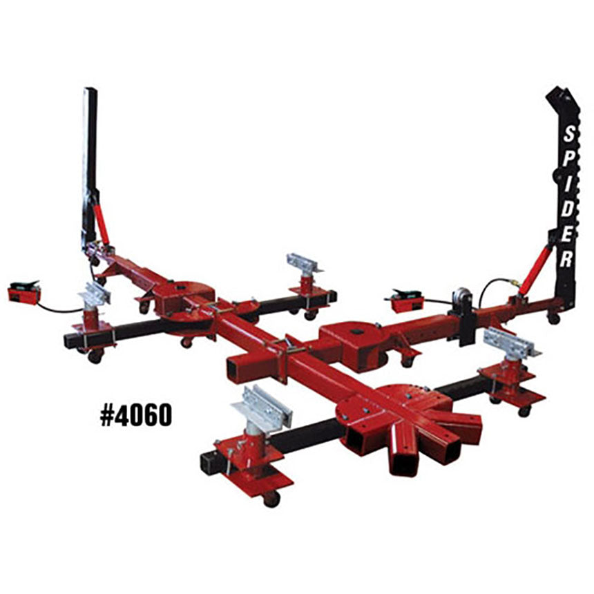 What is it exactly?The Spider is a frame straightening machine that consists of one or two towers (depending upon the model). These posts or upright towers can rotate 360-degrees and move along the perimeter of the Spider to work on different frame areas of the vehicle. The full four point clamping system provides you the best portable frame straightening system in the market. The eight tower mounting positions along with adjustable center mounts and tower swivels, allow you to accomplish all your pulls without the need to remount the vehicle.