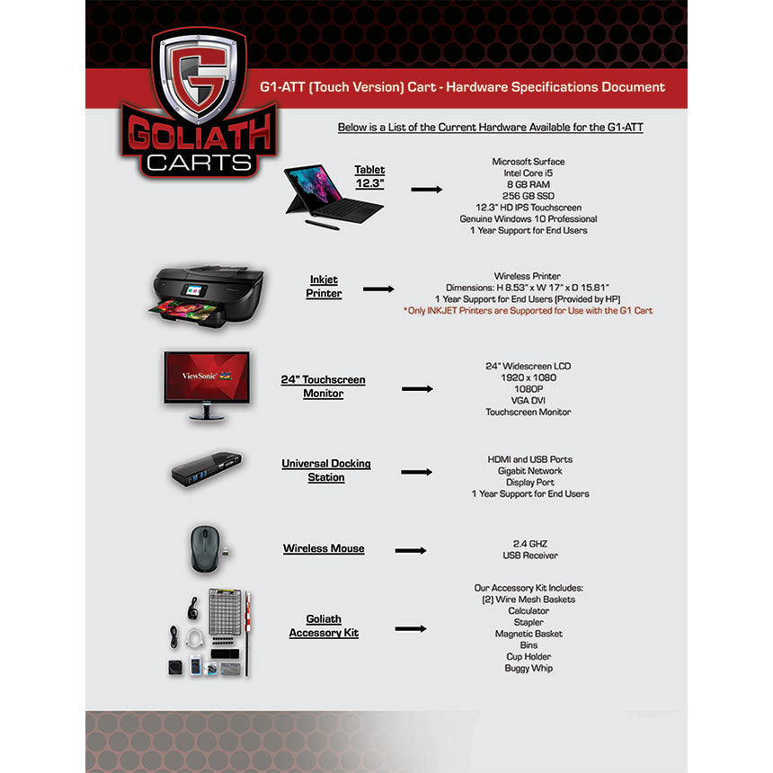 G1-ATT: Our most versatile model. Includes a touch screen tablet and 24″ monitor to have full-function and ultimate flexibility when working. Also includes an Inkjet Printer, Universal Docking Station, Wireless Mouse and our Accessory Kit. For more information, check out the hardware list below in the Glove Department section.