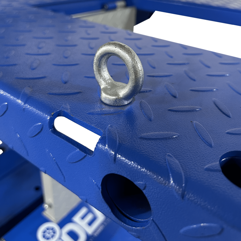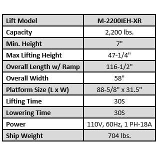 The M-2200IEH-XR Motorcycle lift features our innovative retractable approach ramp system which automatically retracts the approach ramp from the work space while the lift is rising. A spring loaded drop down panel for improved rear wheel service access is integrated into the table. The drop down panel swings out of the way and quickly clips back into place when not in use. We have maintained our hand held pendant for complete operation. No need to put hands or feet in harms way when disengaging safety latches. Vise and Chock sold separately.