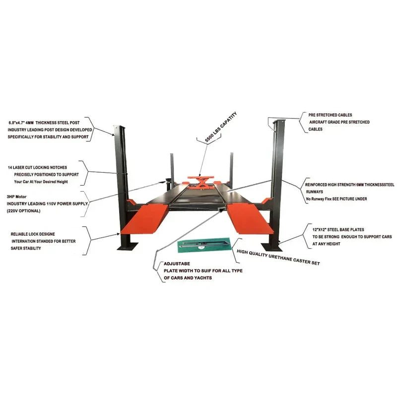 The Katool KT-4H110 Four-Post Vehicle Lift is the ultimate heavy-duty solution for your garage or workshop, boasting an impressive 11,000 lbs lifting capacity. CE approved and certified, it meets rigorous standards with 115% dynamic loading capacity and 150% static loading capacity testing. This lift combines safety, reliability, and convenience for all your vehicle lifting needs.