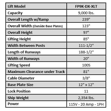 The FP9K-DX-XLT Four Post Lift is designed and constructed to be a commercial grade lift, with industry leading Runway length & Drive-Thru width, allowing the ability to either Store or Service largevehicles. In addition, the FP9K-DX-XLT comes standard with Poly Casters, Drip Trays & Jack / ToolTray, making it one of the best lift values in the industry!